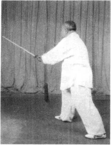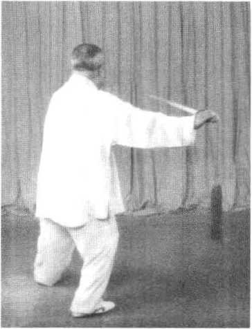 变手心朝下,随同重心右移,将剑带至右后(图50、附图50)。