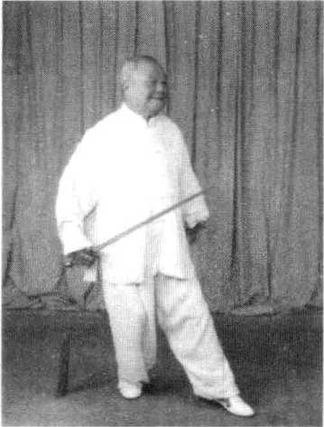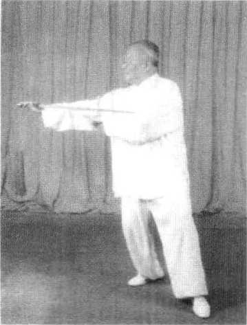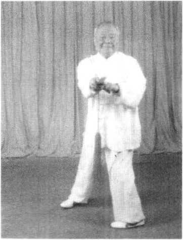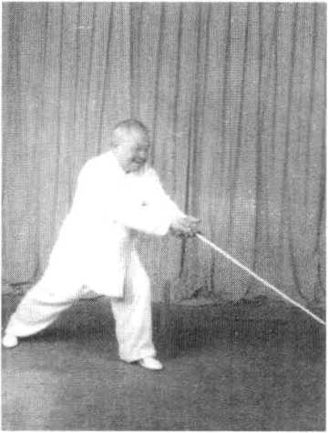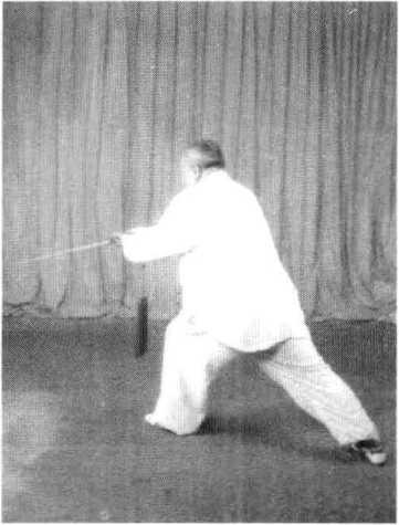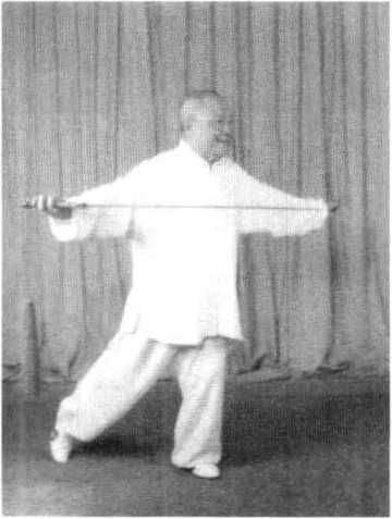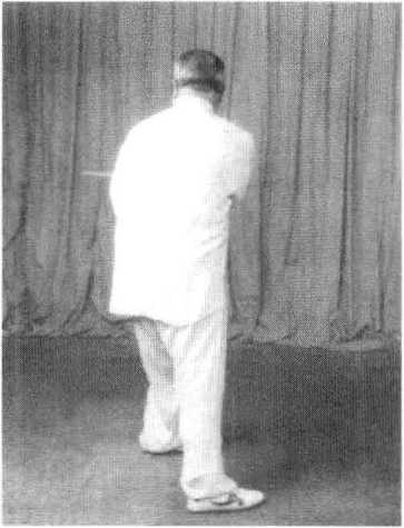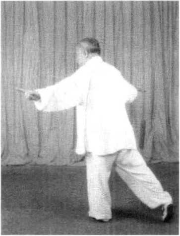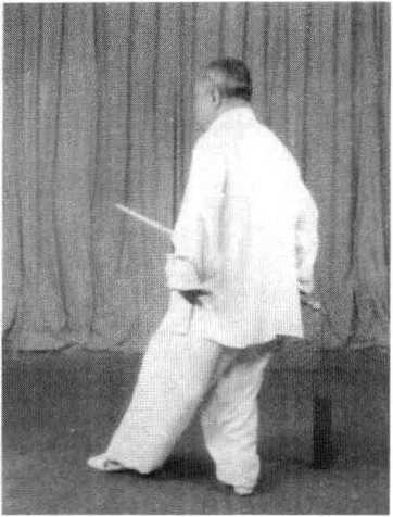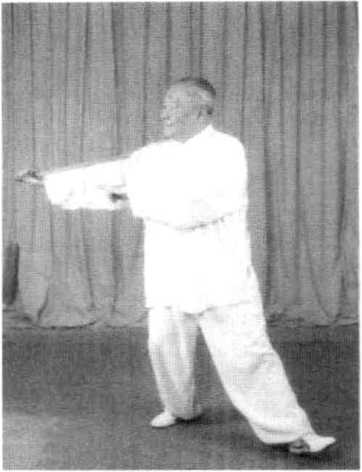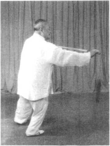 1 .该式转体跨步360度。由于腿部虚实变动,在转体跨步时, 应以左脚掌为轴,转动身躯。