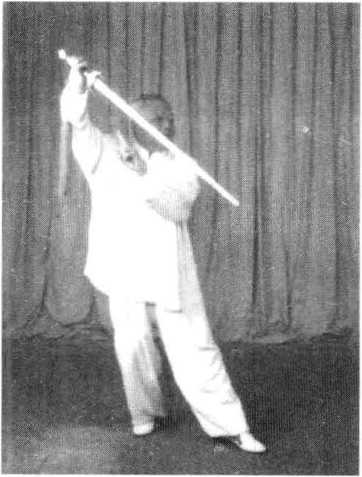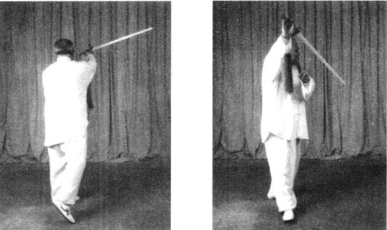 L该式先转身向身后劈, 然后又由后向右前侧方抽拉, 提起崩出,角度较大。剑身先是向左往上,走上圆弧,而后剑身由 上向下往上走右上弧,两者一后一前环一整圈。如果不注意转身 用腰带,必然呈现相互失调。因此,强调转身以腰带背,背带臂,剑 随臂动的要求。