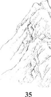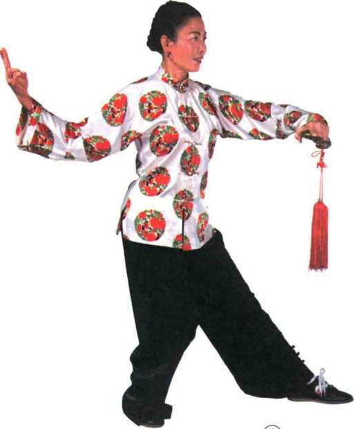 身体右转,左臂屈肘上提,左手 持剑,手心向下,经胸前从右手上穿 出;右剑指翻转,手心向上,并慢慢 下落经腰间摆至身体右侧,持剑手手 心向下,两臂左右展开。同时右腿提 起向前盖步横落,脚尖外撇,两腿交 叉两膝关节前后相抵,左脚跟提起, 重心稍下降成交叉半坐姿势;眼看右 剑指。