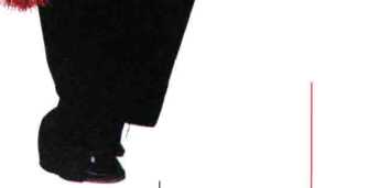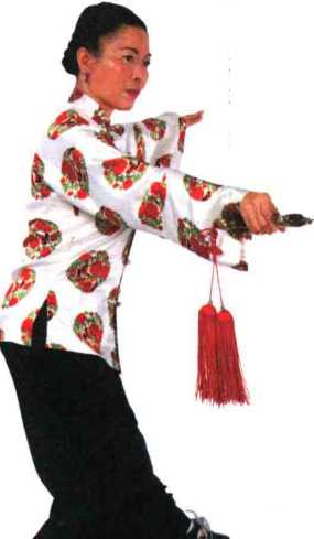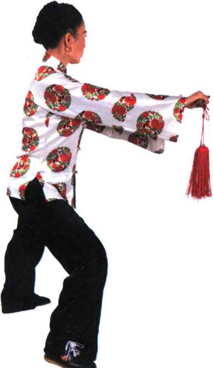 左脚向左前方上步,脚跟着 地;右手持剑向前伸展,身体重心 在右脚。左剑指向外伸出;眼看剑 尖。