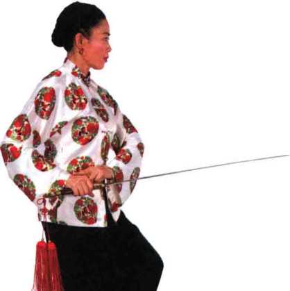 右手持剑屈臂后收时,剑 尖略高,控制在体前中线 附近,不要使剑尖左摆。