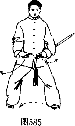 2. 身体慢慢下沉,双腿屈膝慢慢下蹲,成半马步。同时, 双手随之向下、向内慢慢放下,至腹前时,右手手心向下、剑指 对左手;左手持剑略内收,剑尖斜向后上方。(图585)