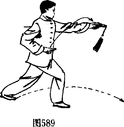 6. 右脚向前跨迈一步,屈膝前弓;左腿挺膝直腿,成右弓 步°同时,右手剑指向下、向内屈臂收置于右腰处,手心向上、 剑指向前;左手持剑从左腰处向前、向上直臂平行伸出,高与 肩平,手心向下、剑指向前,使剑身平放,剑尖向后。目视左 手。(图589)