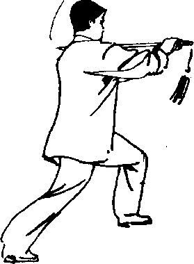 2. 右手接握剑柄,左手变为剑指,贴附于右腕上。右手 持剑向前方点剑,高与肩平,目视剑尖。(图591)
