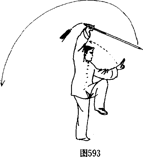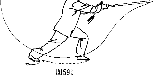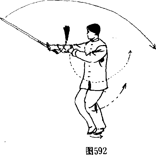 3. 右脚脚尖外撇,脚掌碾地,身体向右转体180%左脚向 右跟步,贴靠于右脚内侧。双腿屈膝半蹲。同时,右手持剑随 转体由上向下翻腕撩剑,再向右、向后方崩撩剑,剑尖斜向上, 高与头齐,手心向右后;左手剑指随之向右摆动,附于右手肘 内侧。目视剑尖。(图592)