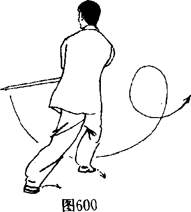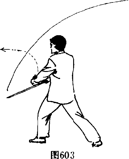 1. 身体略左转。右手持剑向左、向后、向下劈剑,右手置 于腹前;左手剑指附于右手臂上。目视剑尖。(图600)