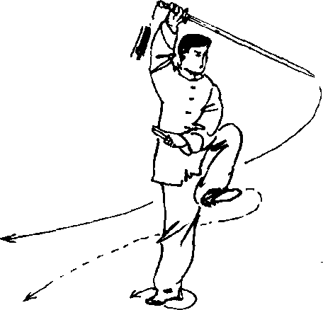 [要 点]动作连贯不停,右手撩提剑,边撩边抽提,提 膝与举剑协调一致,上下相互配合。