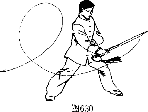 向下,与剑柄屈肘收于胸前。目视剑尖。(图633)