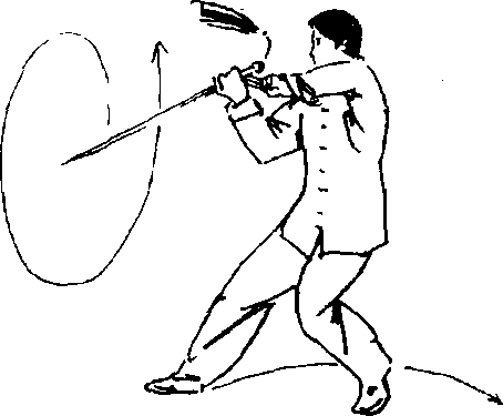 臂,带剑向右、向下、向前立圆划弧剪腕花,手臂屈肘于胸前, 手心向右,与剑柄置于胸前,剑身斜向前下方,剑尖高与腹齐;