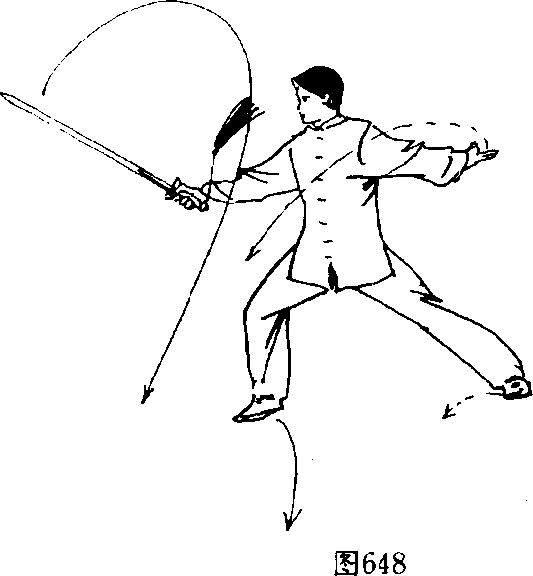 1. 右脚脚尖外撇,身体右转180度,并后坐,屈膝前弓成 右横弓步。右手持剑向上、向右、向后划弧劈剑,手心向左,剑 身斜向上,剑尖高与头齐;左手剑指向体左侧分臂直伸,手心 向后,剑指向左。眼随剑走。(图648)