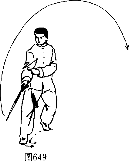 2. 随即,左脚向前斜迈半步,右脚跟随也向左前方横迈 一步,脚尖着地,双腿屈膝半足,成右虚步。身体向左转90 度,转正对前。同时,右手持剑随之也向左、向前划弧挥劈剑, 剑身斜向前下方,右手手心向左,高与腹齐,剑尖高与膝齐;左 手剑指向前、向内收置贴靠于右手臂内侧上,眼随剑走。(图 649)