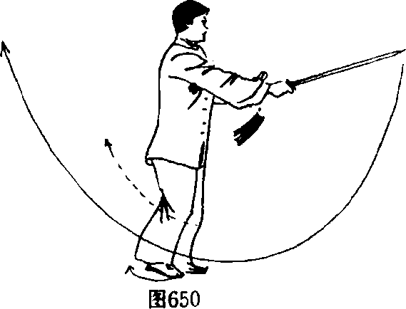 1.左脚向前跟迈一步,贴靠于右脚内侧旁,然后双脚 尖向左转,双腿屈膝略上立,身体向左转90度。同时,双手持 剑向上带提,随转体再向前方点刺,右手手心向左,高与胸齐, 剑身斜向前上方。目视剑尖。(图650)