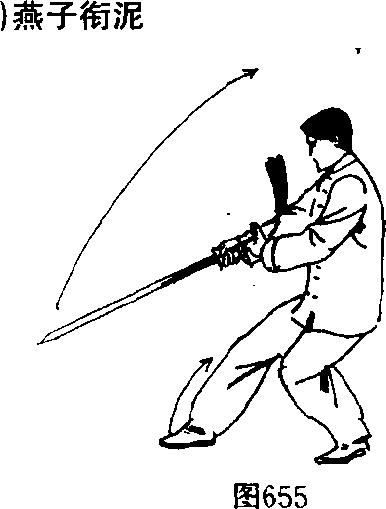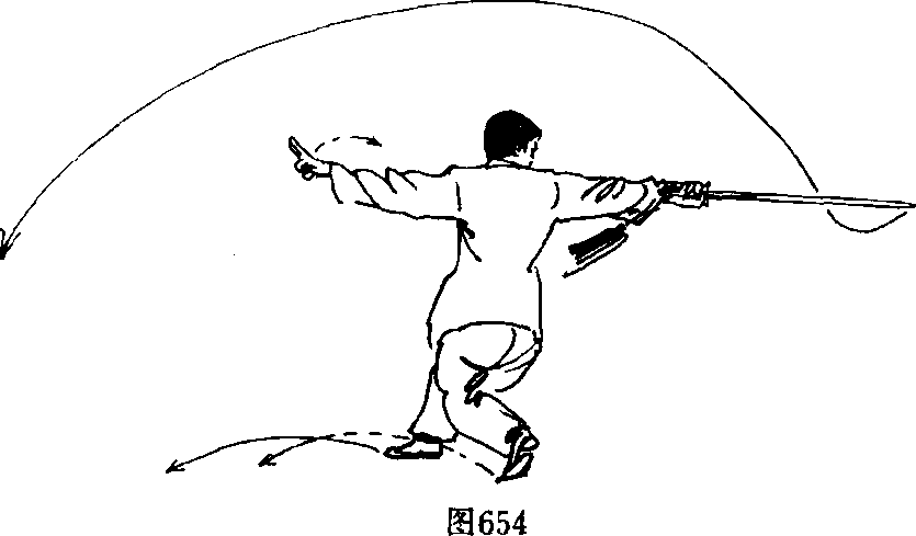 3. 右脚向回略收半步,脚尖外撇,双脚脚前掌眼地,向右 转体,身体向右转并下沉倾俯,双腿成坐盘势。同时,右手持 剑先向右、向前内旋转臂划一弧形,再随转体而向右、向后经 过双腿膝前向上反手撩剑,右手手心向右后,手臂平直,与剑 身成一水平直线,与肩高齐;左手剑指随之也向左侧伸直展 臂,手心向后,剑指斜向上。双臂与剑成一直线,眼随剑走。 (图 654)
