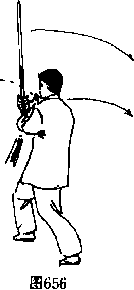 右脚向右侧横退一步,重心向右移至右腿屈膝右弓,成右 横弓步,身体挺立。同时,右手持剑向上、向右、向后划弧带 剑、劈剑,右手手心向左前,置于右后方,高与肩齐,剑身垂直 向上;左手剑指向左侧分臂,手心向下,剑指向左上,手臂伸 直,高与肩平。目视左手剑指。(图656、657)