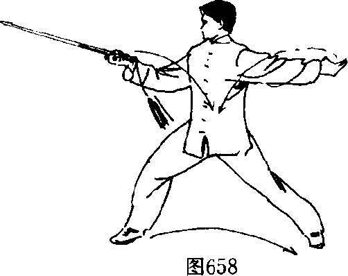 右脚向前斜迈一步,屈膝前弓,成右弓步,身体左转并前 挺。右手持剑从后向下、向前,经过右腿侧旁再反手向前、向 上撩剑,手心向上,高与胸齐,剑身斜向前上方,剑还有高与头 齐;左手剑指随之向左、向后划弧横摆于左侧后方,手心向后, 剑指向左。眼随剑走。(图658)