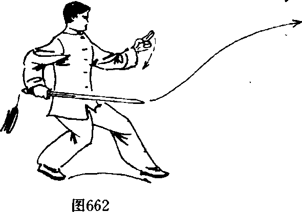 1 .身体向左转90度,重心移向右腿,身体右坐。左脚提 起,向左前方横摆一步,脚尖点地,双腿屈膝半蹲,成左虚步。 同时,右手持剑从上向左、向下、向前划弧转臂拉带剑,剑身平 直于右腰旁,剑尖向正前方,右手向右后方屈臂拉推剑柄;左 手剑指随之向前落下,于胸前向正前方指出,手心向右,剑指 向前。目视前方。(图662)
