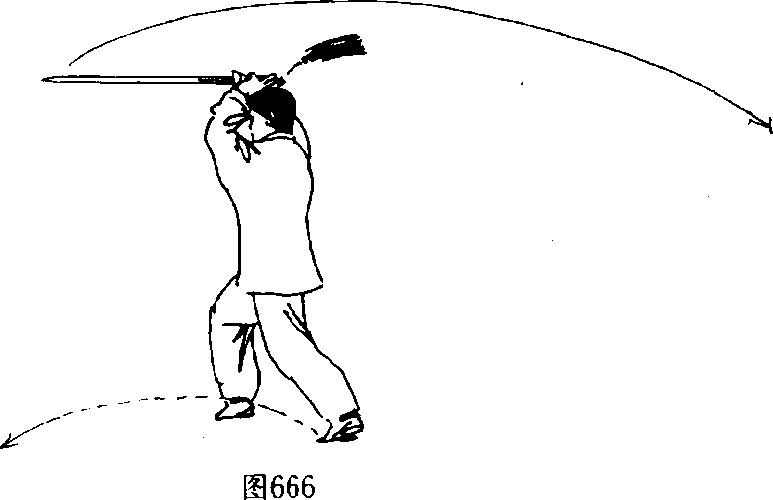 上方,剑身平直剑尖正对左侧前方,右手手心向外;左手仍贴 附于右手腕上,双手屈肘横臂架于头前。目视剑尖。(图 666)