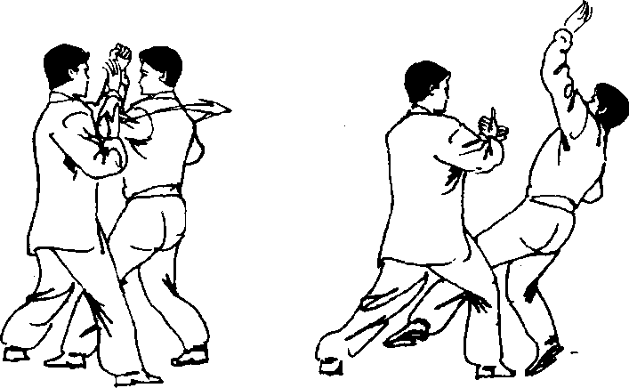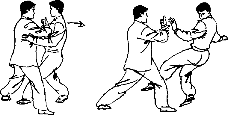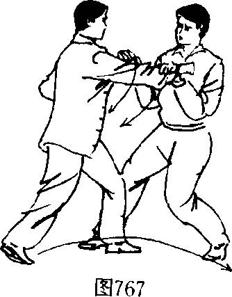2. 乙粘制甲方双手向下、向右“捋”化,欲还击。甲方顺 其捋势,右手屈肘曲臂,粘靠于乙方双手上。同时,右脚向前 迈插一步,扣绊乙方双脚间。(图768)
