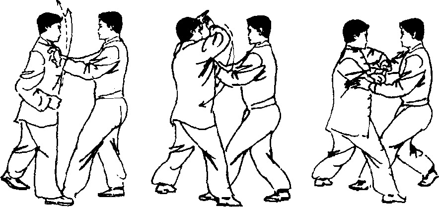 [要点}双手合臂合肘,以逼靠乙方,使其不能变招还 击,甲方乘势进击发力以解抓手之围。