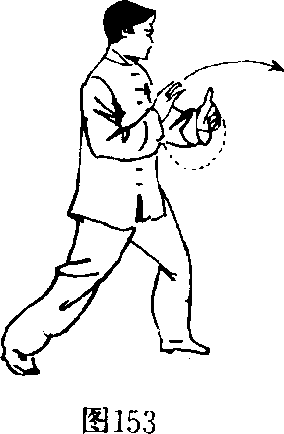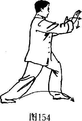 1 .左脚向前下方落下踏实,屈膝前弓成左弓步。右掌向 前平划,掌心向前;左掌向下、向内划弧,收置于右手臂内侧 旁。(图 153、154)