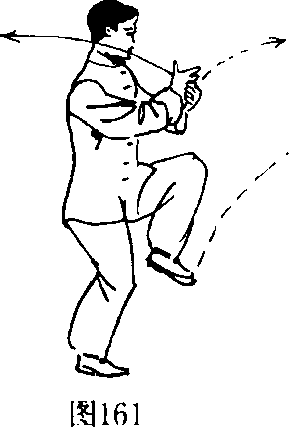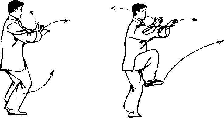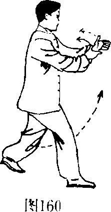 5. 身体重心前移至右腿,身体前挺。左腿向前上方屈膝 提腿,收控于胸腹前,身体略向右转。同时,双手向内路收,交 叉搭于胸前,掌心向内。(图160.161)