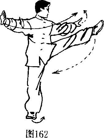6. 身体略向右转,右脚脚尖外撇,略直稳立,左脚同上 势,向左前上方直腿踢出。双手向左右两侧分臂。(图162)