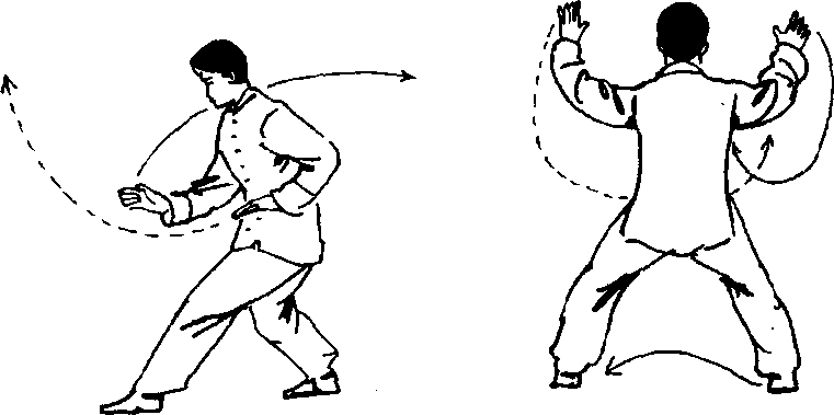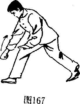 1. 身体向上挺立,重心后坐,右拳变掌亦向上提起。(图 168)