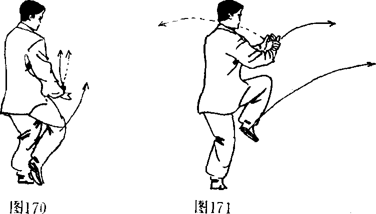 4. 双手向上交叉托起于胸前,左脚站立,右腿屈膝向上 提起。目视右前方。(图171)