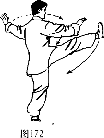 5. 身体不动,右脚直腿向右前方蹬出,脚尖上勾,高与胸 腹齐。目视右脚(图172)