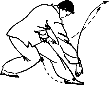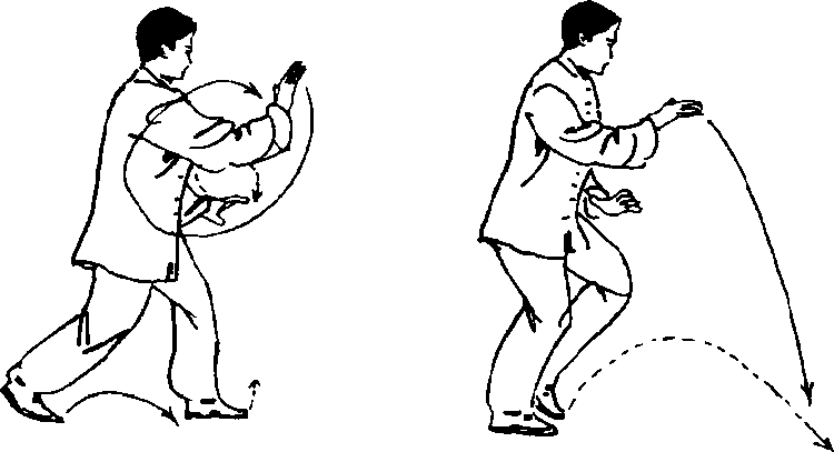 [要 点]迈步、跟步要轻巧、灵活、稳健,含胸收腹,以 腹部紧贴大腿部。双腿尽量下蹲,右肩前送,力达掌指尖。