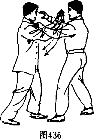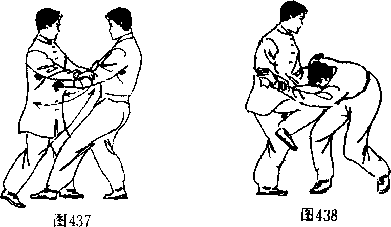 “捋”而带化。同时起右脚,屈膝上提,以膝尖部向上顶击乙方 头部。(图 437.438)