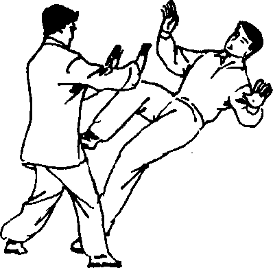 [要 点]双手下捋,捋而按化,迫使乙方俯身低头,然 后乘势提膝顶击。上下相互协调、配合,互为对劲。