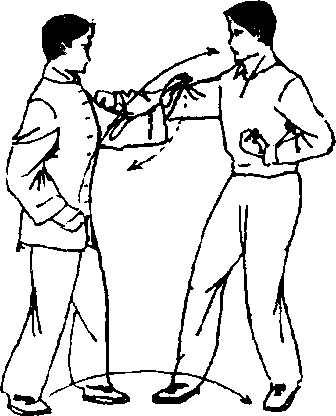 1. 甲方站立。乙方左站势,上步进身,出左直拳攻击甲 方胸口。甲方立即向左方侧身闪避,并出左手向上、向右拦截 捋化其手。(图476)