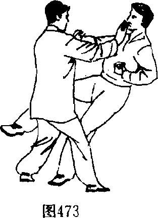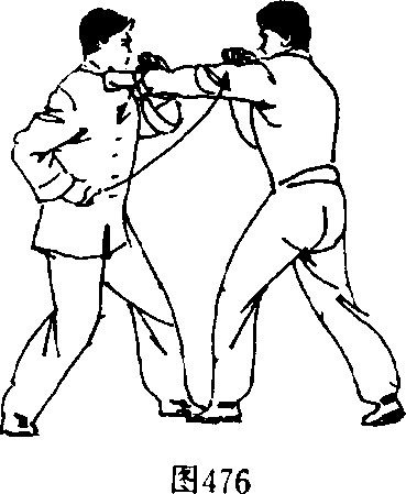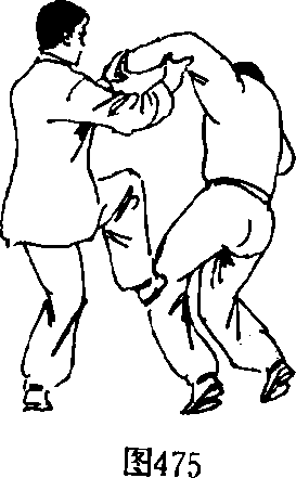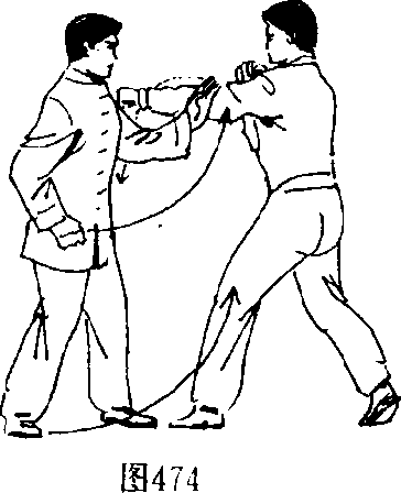2. 随即甲方左脚脚尖外撇,身体前挺并左转,起右脚(脚 尖上勾)向前、向左划弧勾踢乙方左腿膝部,同时,左手反手粘 持乙手向左下方捋化,并出右立掌向前、向上“拥”劲托架上 挑,拥击乙方左手肘部,使其上下受击而败。(图475)