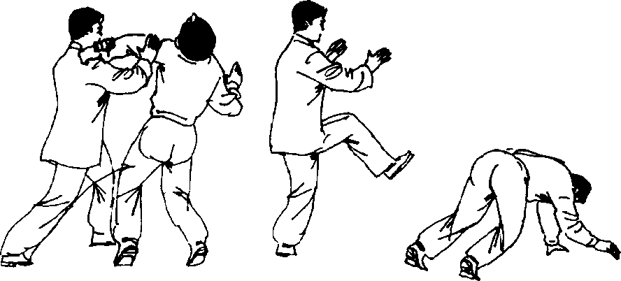 3. 甲方双手粘持乙方,向前掷出,并提起右脚,脚尖上勾 向前蹬击乙方前腿,使其向后仆出。(图478)