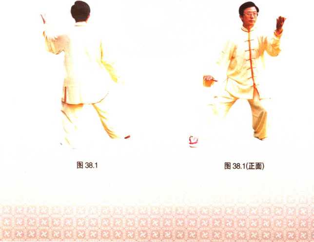 接上式,身体向右后转,左脚尖内扣,重心微移至右腿的同时,右掌向 下、向右划弧于右髓外侧,掌心向下,掌指向前;左掌转动,掌心向上,平 展于左肩前,掌指向前,腕与肩平;眼随身体转动向前平视(图38.1)。