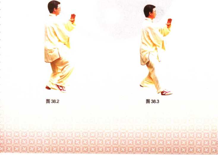 重心在左腿,右脚提起于距左脚跟约一脚远处,脚前掌踏地,然后以 左脚跟为轴、脚尖内扣;身体继续向右转,右脚提起向前迈步,脚跟着地; 右掌经腹前至左肘下,掌心向上,掌指向后;左臂平屈于胸前,掌心向上, 掌指向前;眼视左掌方向(图38.2、图38.3)。