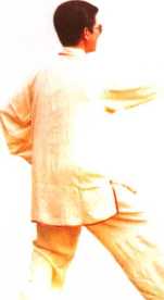 身体向右转,右脚外展45度,右脚 全脚掌踏实,重心移至右腿;左脚提起 向前迈步,脚跟先着地;随身体转动,右 掌翻转掌心向下,屈臂横肘于胸前,掌 指向前;左掌向右划弧于右腹前,掌心 向上,掌指向后;眼随身体转动向前平 视(图 39.2)。