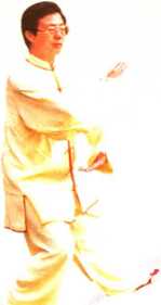 接上式,左脚以前脚掌为轴、脚 跟向内微拧转,重心移至左腿,身体 向左转,右脚提起向前迈步,脚跟先 着地;随身体转动,左掌向左、向下 划弧于左髓处,掌心向上,掌指向前 下方;右掌心转动向上,平展于右肩 前,掌指向前,腕与肩平;眼视右掌 方向(图39.1)。