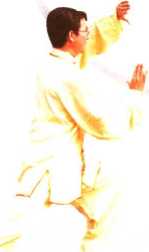 身体向左转,左脚全脚掌踏实,左 腿屈膝慢慢向前弓出,成左弓步;左掌 向前、向上翻掌上举至额前上方,掌心 转动向外,掌指向右;右掌向前推出,掌 指向上与肩平,掌心向外;眼向前平视 (图 39.3)。