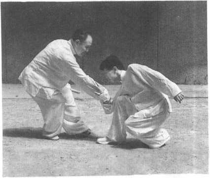 设对方以右 手握我右腕,我 即屈右肘坐右 腿,向右转体将 右手向右侧提 回。设对方欲乘 机袭我,我即折 腰下沉,将右手 腕顺势松动走 脱。图39 该势为一提劲,一沉劲,两者虽非直接出击之势,但对方在意想不到的情况 下,突然串现,会使彼根力自断,我可乘机进攻(图39)。