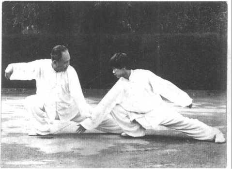 设对方以右手握我之左手,我以放低姿势,把左手收至胸前 引深牵制对方,使之身体前倾,失去重心(图63)。设对方顺势以拳击我左胸,我可翻手搭住对方右手腕,往我 左侧下采之亦可。图63