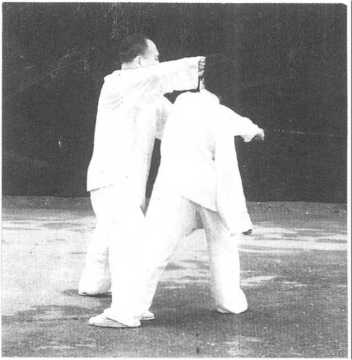 设对方以两手击我未遂,欲后撤我即坐腿上步用左手搭 对方肘部,右手握对方腕部,向我右侧用提劲粘住,拔其拫力。再 由右向左以沉劲随之转动弓出右腿,用合劲以双手握拳,右拳击 对方头部,左拳击对方胸部(图73)。图73