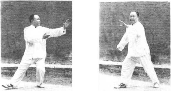 3. 注意脚之迈出着地以后,两臂当即随同腰腿转动而进行环 臂。脚不着地,请勿转动。连迈步带转体环臂,这是不妥的,要注意 其根在脚,发于腿,主宰于腰,行于手指的程序,这是不能违背的。 其他拳势,也必须遵循这一程序进行。
