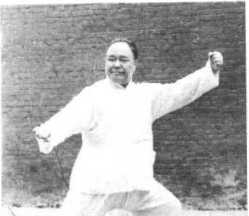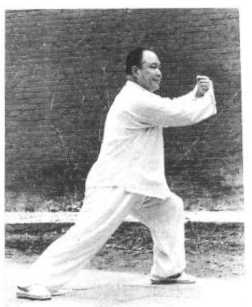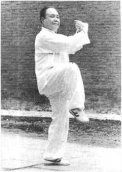动作3:站起左腿,提起右腿,向正前方蹬出,同时两手松拳 向左右分开,掌心侧向外。右臂指向正东,左臂指向西北,眼看正东 (图186,参看图172)。