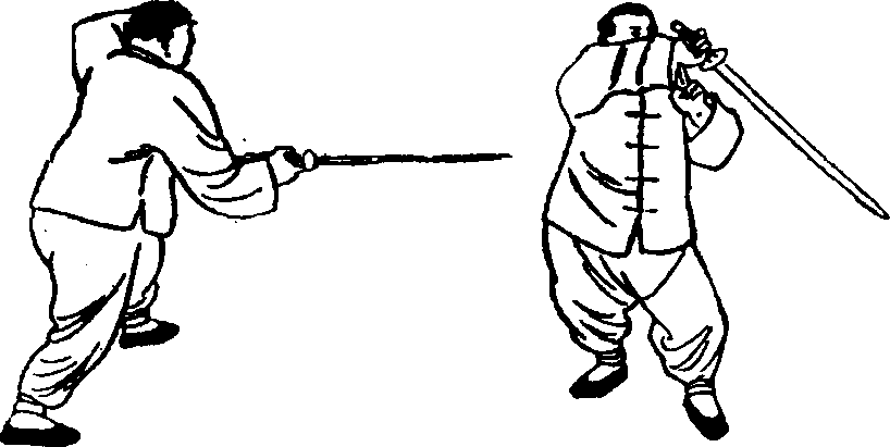 【用法】先搅对方剑或腕部,再转身平刺对方膝部。