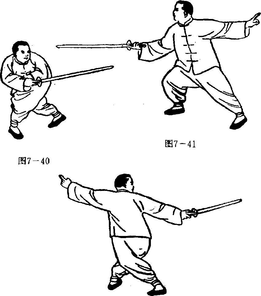1.接上势,左脚向前横步落地,上体左转,两腿屈膝下蹲, 成叉步;同时,剑尖下垂,至与左膝齐向后平刺,左手食中二指 仍置于右腕背上。目视剑尖。(图7—40)