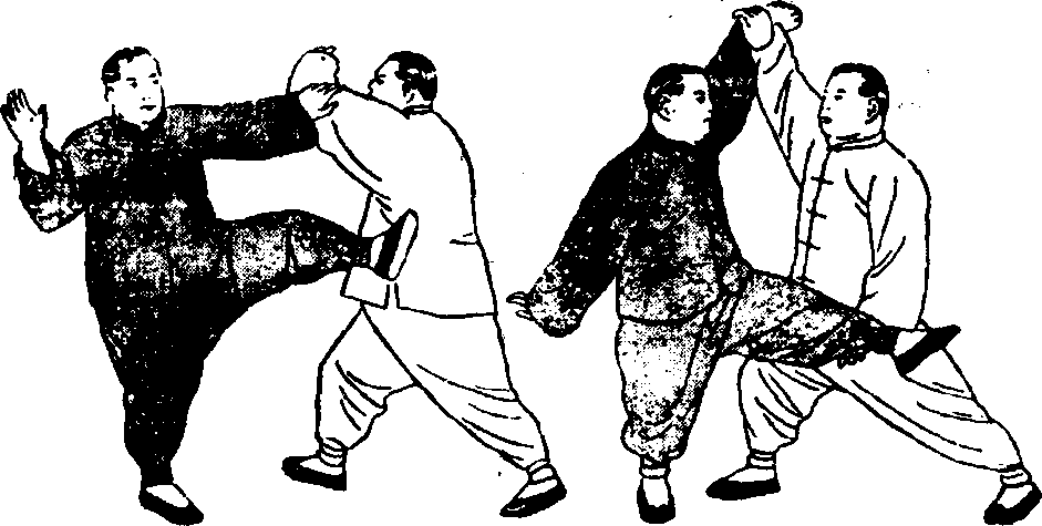 甲在被搂至将背时,落下右足,左手随腰腿右转势,向右 由乙左臂下抄执乙左肘,乘势以左足尖踢乙左腋部。(图10- 57)