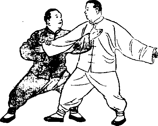 甲在被采将靠到 时,右手随腰腿左转势 向左往后绕圈化开乙 攻势,并采执乙右手 腕;同时撤右步后上左 步,置于乙右腿后,左 臂由乙右腋下伸至乙 胸前,随势向左往前搠 去。(图 10 — 61)